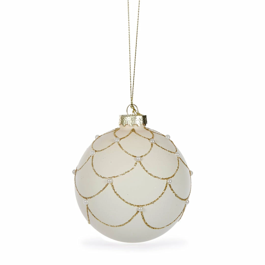 These beautiful scalloped glass baubles adorned with pearls, will add a touch of timeless elegance to your tree decor this Christmas.
