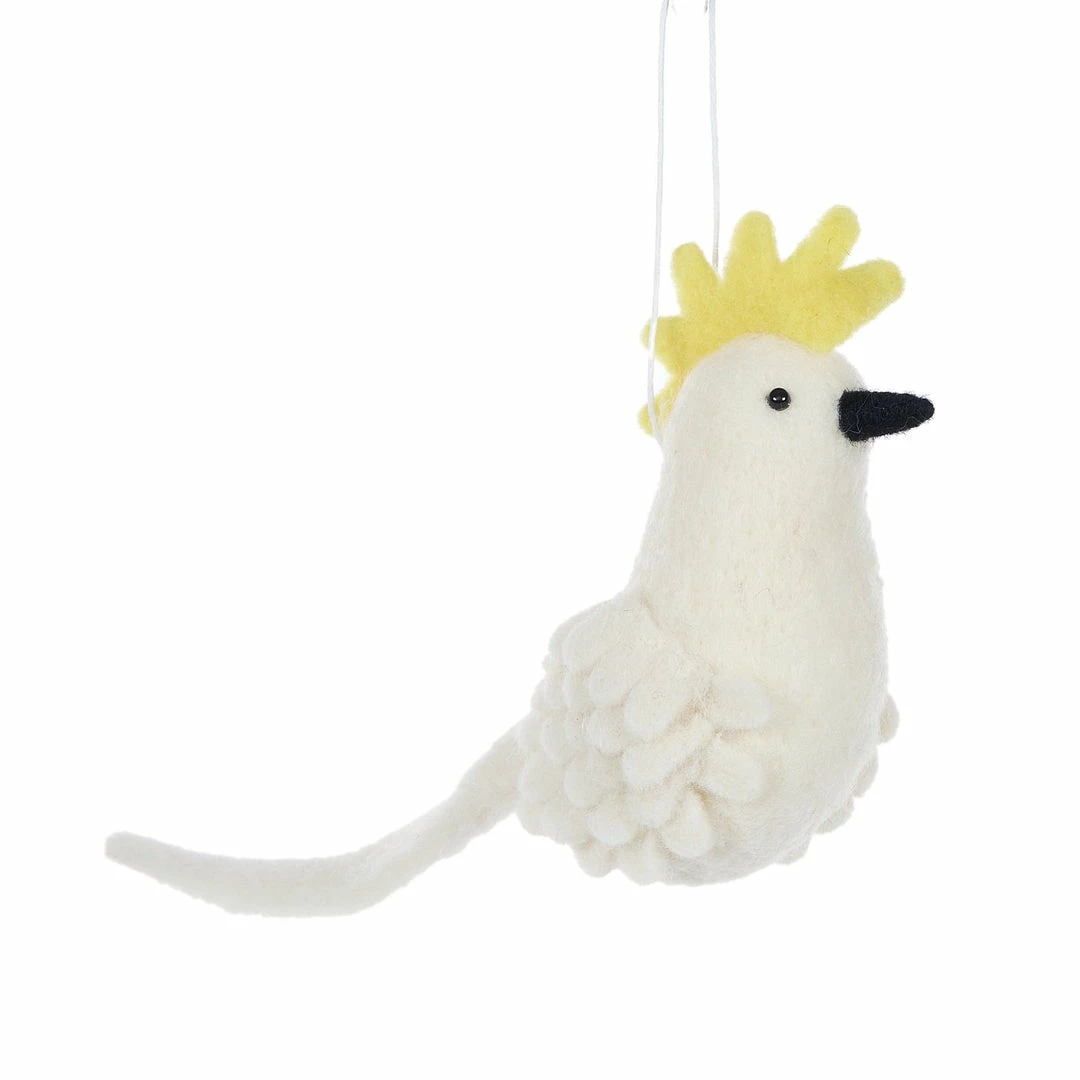 A sweet little yellow crested cockatoo inspired Christmas tree ornament.Ā Have your tree looking its best with this woollen cockatoo, complete with beautiful wing detailing and a long tail.Ā Hand made, designed in Australia.