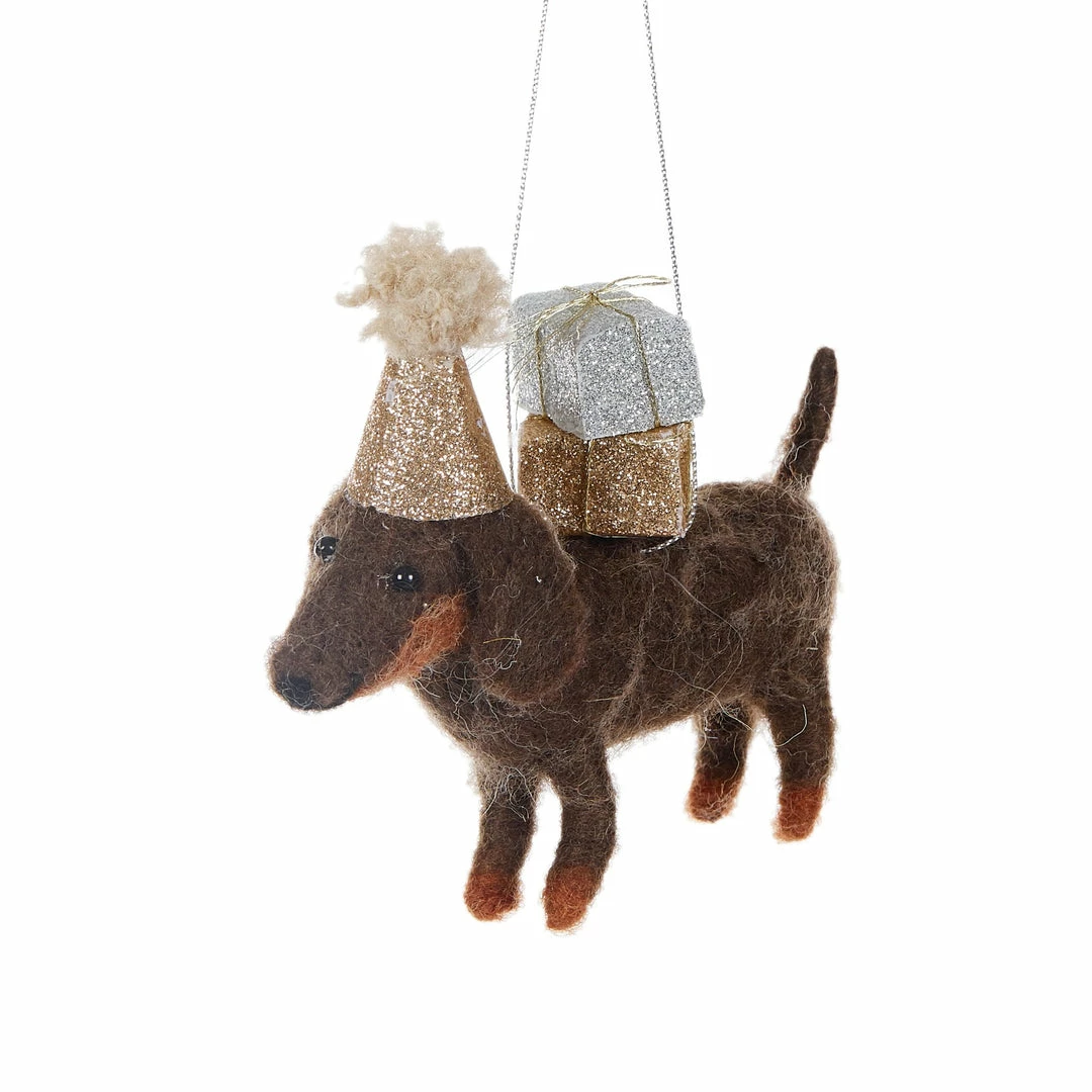 A sweet little puppy dog inspired Christmas tree ornament. Have your tree looking its best with this woollen sausage dog, complete with sparkly party hat and presents. Hand made, designed in Australia.