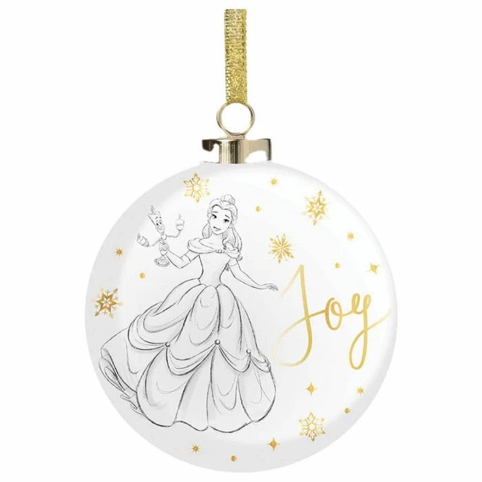 Decorate the Christmas tree with this beautiful white Belle ceramic bauble. The caption ‘Joy’ is featured on the bauble in gold lettering alongside an illustration of Disney’s Belle.