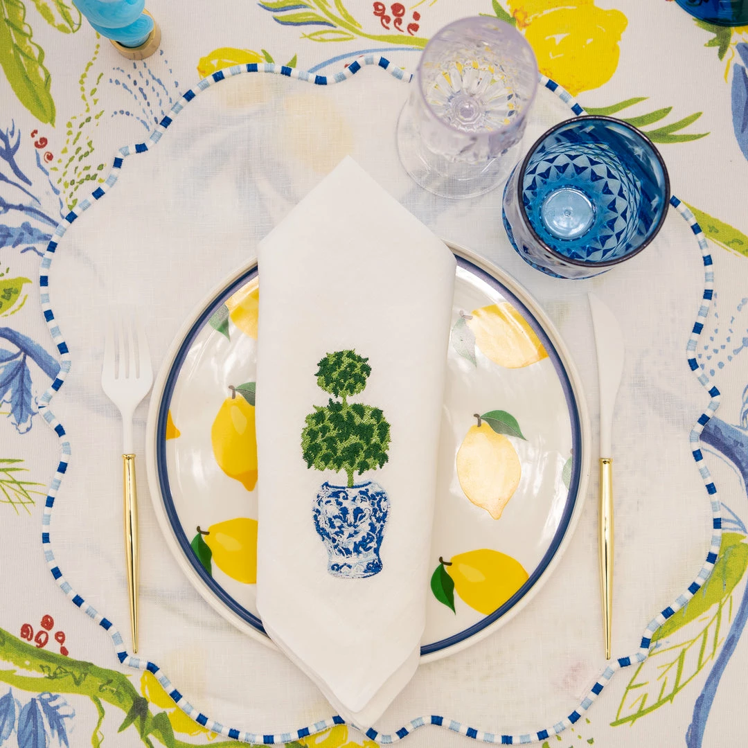 Create a stunning table setting with these classic embroidered napkins. Our Bleu embroidered napkin set, made of 100% linen can be paired with the Mediterranean tablecloth or style them with a solid coloured tablecloth.