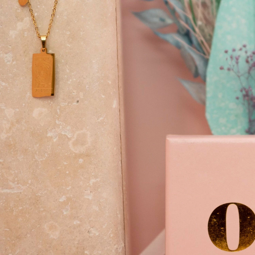 - Tarnish free 18K gold plated stainless steel pendant necklace, 19cm long chain, clasp closure, laser etched front and back