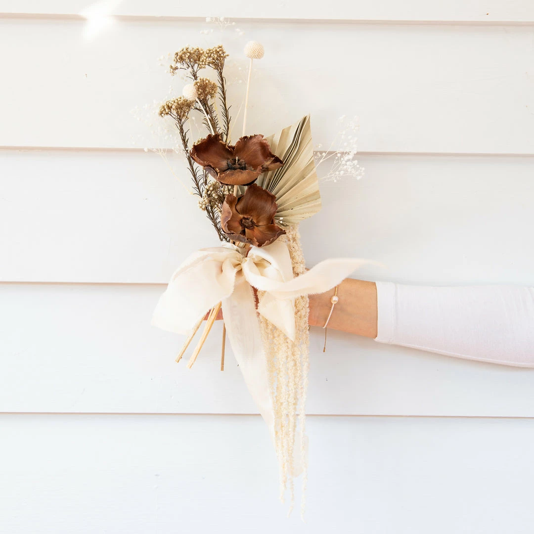 Our beautiful natural bouquet uses a colour palette of white, cream and light brown to create a beautiful boho arrangement. This is the perfect addition to complete your wedding look or be a flawless bridesmaid bouquet. The arrangement can be cherished for years to come; reminding you of your magical day. Hand-made with love in Melbourne.Â