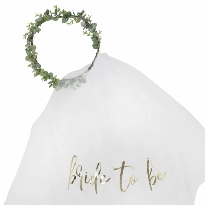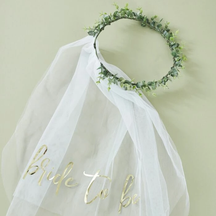 Ensure the beautiful Bride-to-be celebrates in style on her Hen Do with this stunning Eucalyptus crown with veil The crown has a lovely white veil with Bride to Be gold foiling design which is sure to be loved by all Hens!