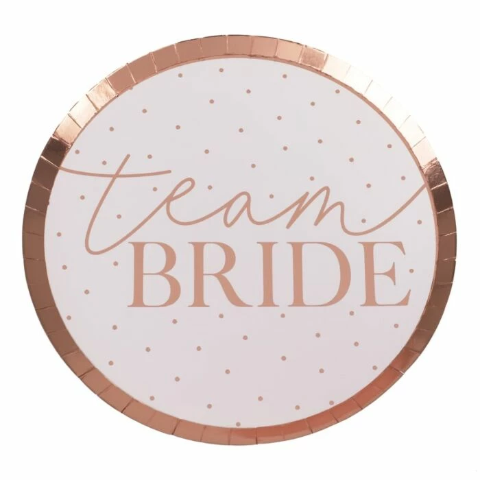 The Team Bride rose gold and blush pink paper plate is perfect for eating tasty hen do treats in style. Whether you are dancing around the room or having a sit down meal, this plate will make sure the celebrations stay stylish!