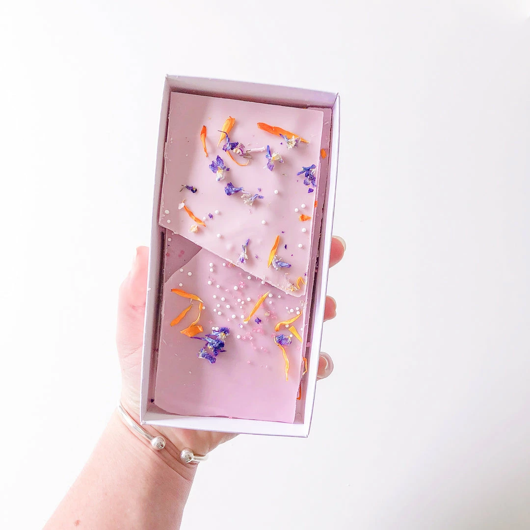 Perfect for a gift, party favour or to indulge in yourself! Our pretty chocolate shards decorated with edible flowers come beautifully packaged, available in light pink and lilac.