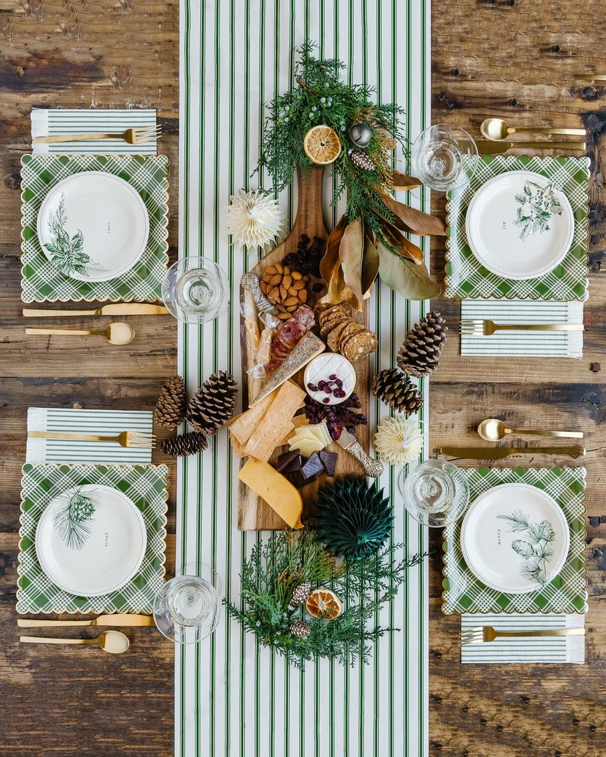 Make this Christmas merry by setting a festive holiday table, these scalloped plates are the perfect place to start. Featuring a scalloped edge with gold foil accents, these paper dinner plates combine perfectly with our green vignette plate set and honeycomb trees creating a simple and understated tablescape that makes for a cosy Christmas gathering.