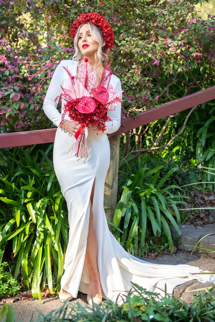 Make a show stopping statement on your wedding day with this beautiful burnt red and dusty pink bouquet. This arrangement can be cherished for years to come; reminding you of your magical day. Handmade with love in Melbourne.Â