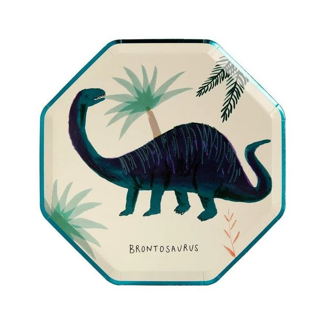 Get your party started with these fun dinosaur kingdom side plates! Perfect for a dino themed party. They feature beautifully illustrated dinosaurs with shiny copper and green foil details.Â