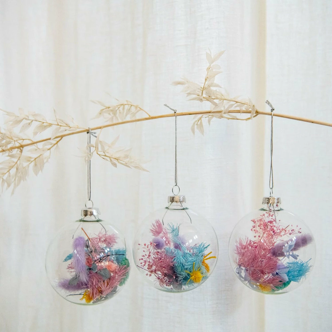 Each set contains: 3 x 80mm glass baubles filled with dried flowers.