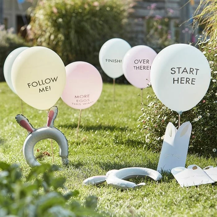 Each Easter Egg Hunt kit contains 5 headbands for the hunters with 5 treat bags and 10 Balloons printed with directions, plus wooden sticks to use to dot them around your garden!