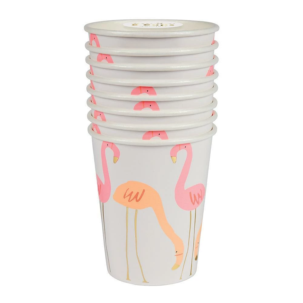 Pretty peach and pink flamingo cups. Nothing says summer celebrations like the addition of bright pink flamingos! These stylish party cups are decorated with a beautifully illustrated pattern in shades of neon pink, embellished with shiny gold foil. Perfect for a Tropical Party!