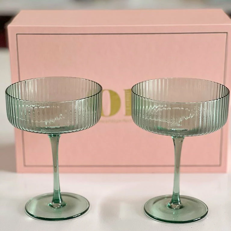 Our new handmade green ribbed glasses are an elegant tableware addition. Made from handblown glass, they are perfect for any event. Toast to good times with our stylish pink glasses. Packaged in a beautiful pink gift box.