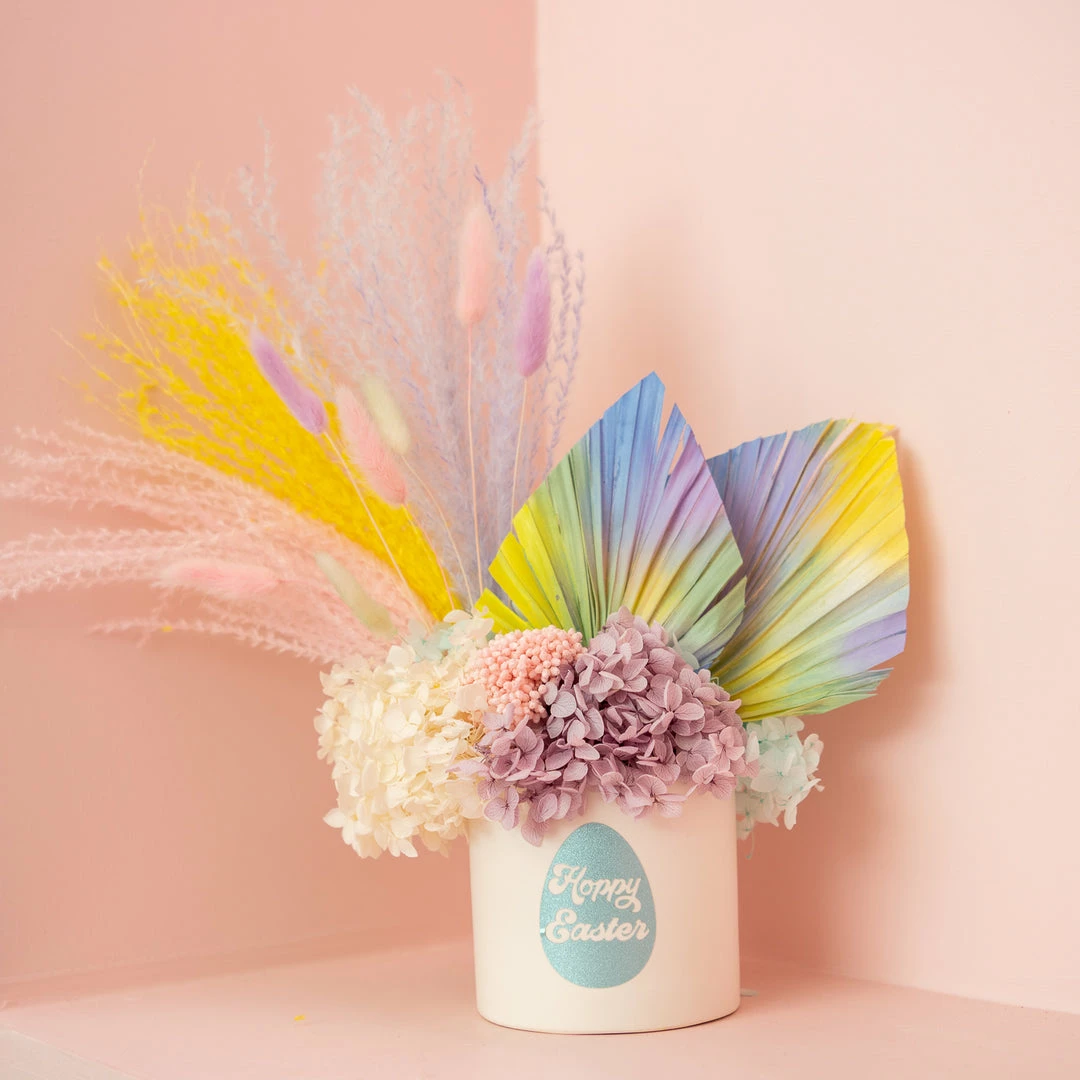 Our cute vase arrangement will make any celebration “Hoppy”! Will make a beautiful everlasting gift. Sticker on the vase can be removed or customised if you are buying for an occasion other than Easter.