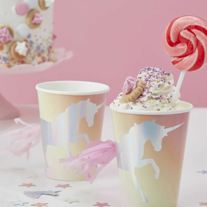 You’ll be spell bound by the ombre rainbow background and iridescent foil unicorn detailing. The pink tassel tail will have your guests believing in the magic of unicorns. Place with our Iridescent unicorn plate and Unicorn Napkin Horn for a truly whimsical unicorn party celebration. Please fluff the unicorns tail to make her magical.