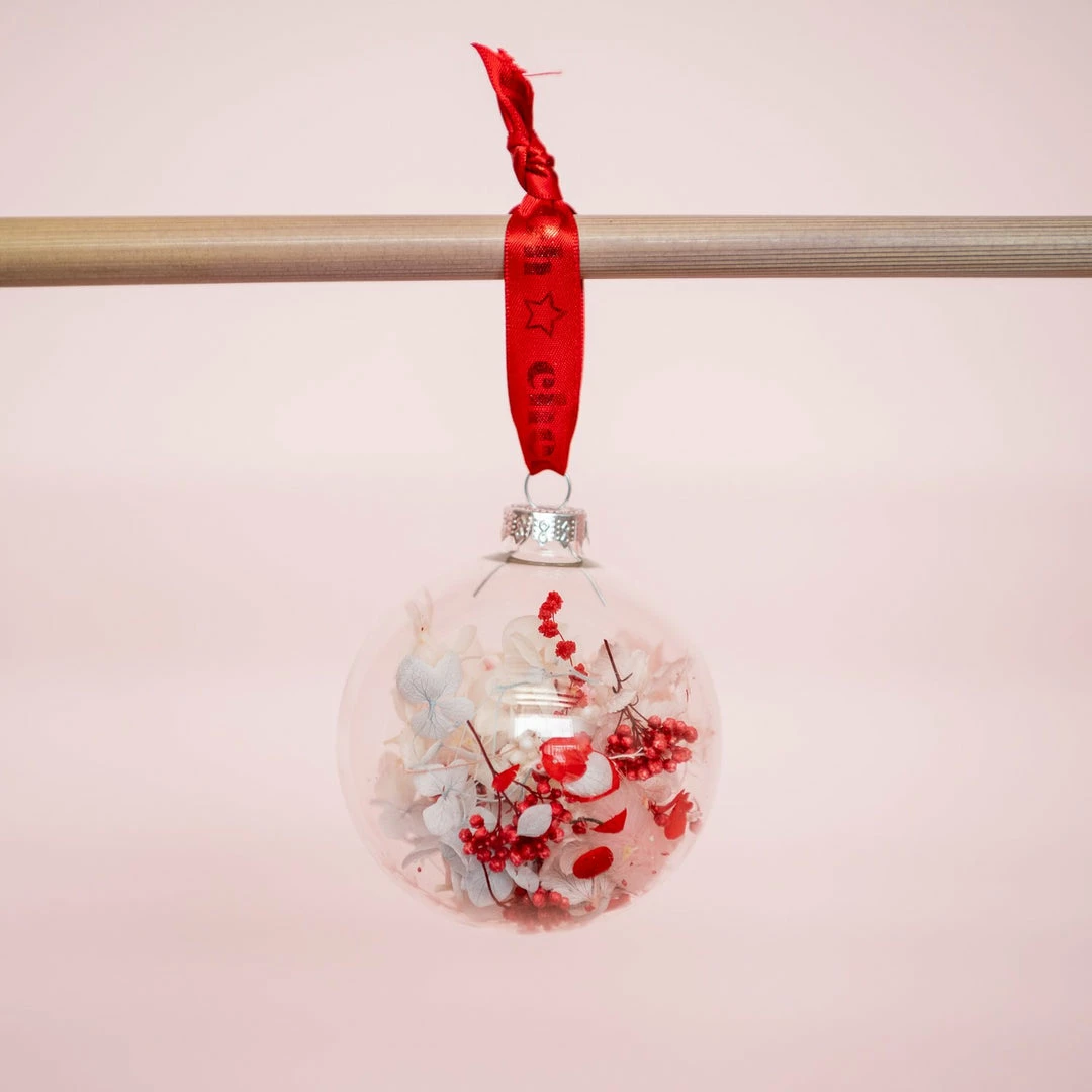 A sweet glass bauble to decorate your home all year round and to move over to your Christmas tree during the festive season, each bauble is filled by hand with a handful of beautiful dried flowers and finished with our printed Christmas satin ribbon. These are a sweet and special hanging decoration for yourself, to gift to a friend or a loved one.