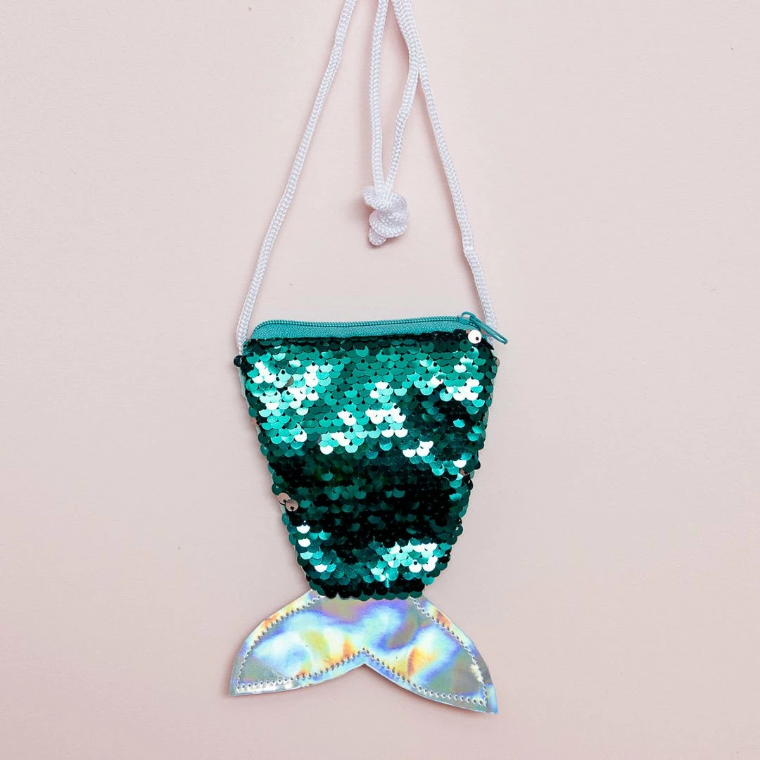 This sweet mermaid tail coin purse will suit any little mermaid. Perfect for spare change, a lip gloss or bits and bobs.  Featuring sparkly sequins and stitched fin tail. Â