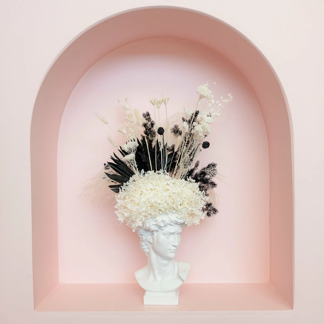 Our David Head vase arrangements are inspired by the Michelangelo’s David statue in Florence. Re-imagine the classic form of the original “David” sculpture into an everlasting statement piece for your home or event.
