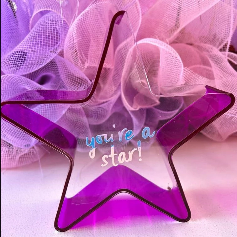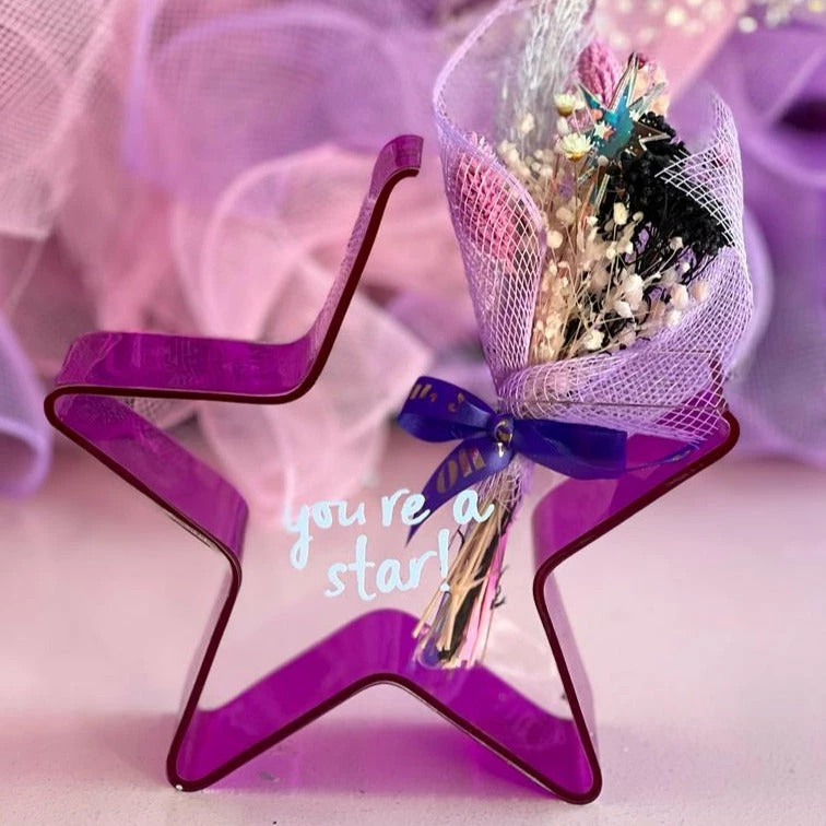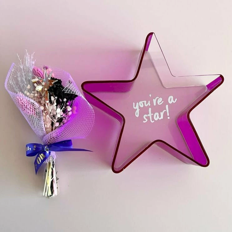 Spoil Mum this Mother’s Day (in-person or from afar) with this cute little everlasting posy, in our exclusive Star shaped acrylic vase. Each vase comes with a decal “you’re a star!” Each box comes with a foil gift tag that we can hand write or leave blank for you.