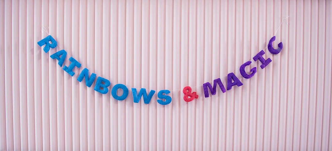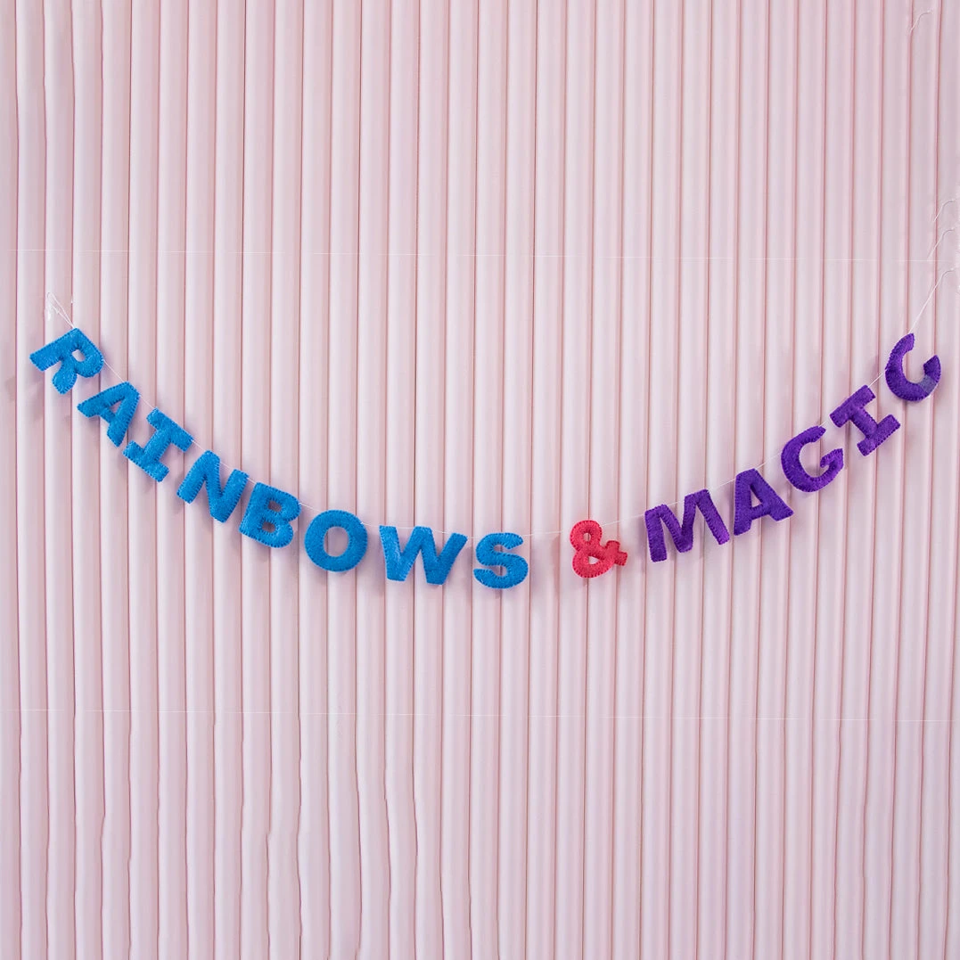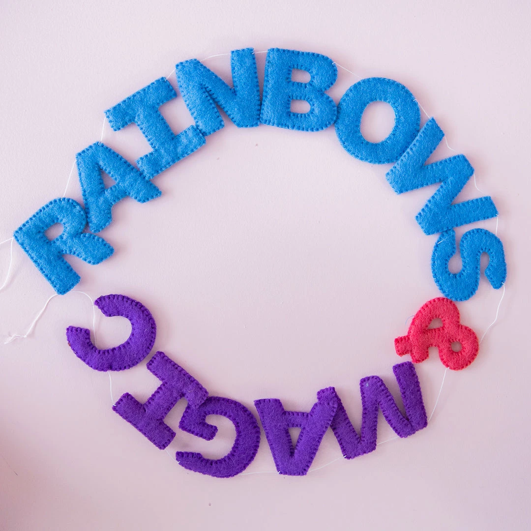 Your guests will love this sweet handmade felt banner.Ā It can compliment any dessert table or add some magic to a bedroom dĆ©cor.Ā ‘RAINBOWS & MAGIC’