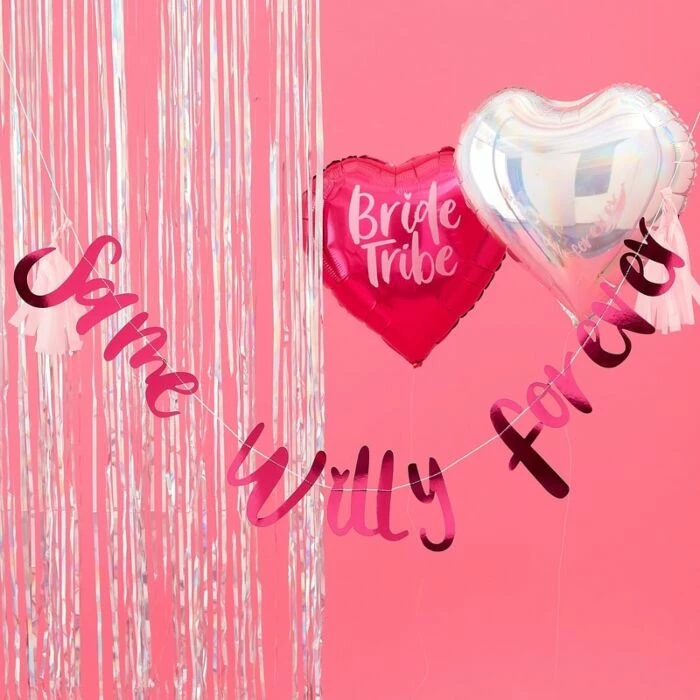 The funniest backdrop to get any hen party started metallic pink ‘Same Willy Forever’ bunting! Make your hen party pop with this fun bunting to hang up! Everyone will want a photo in front of this funny backdrop!