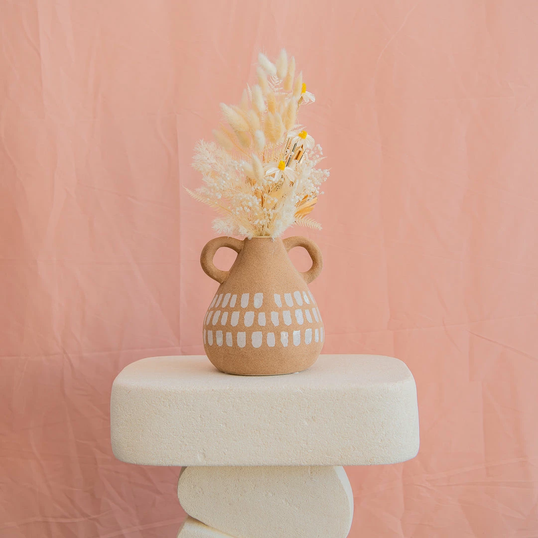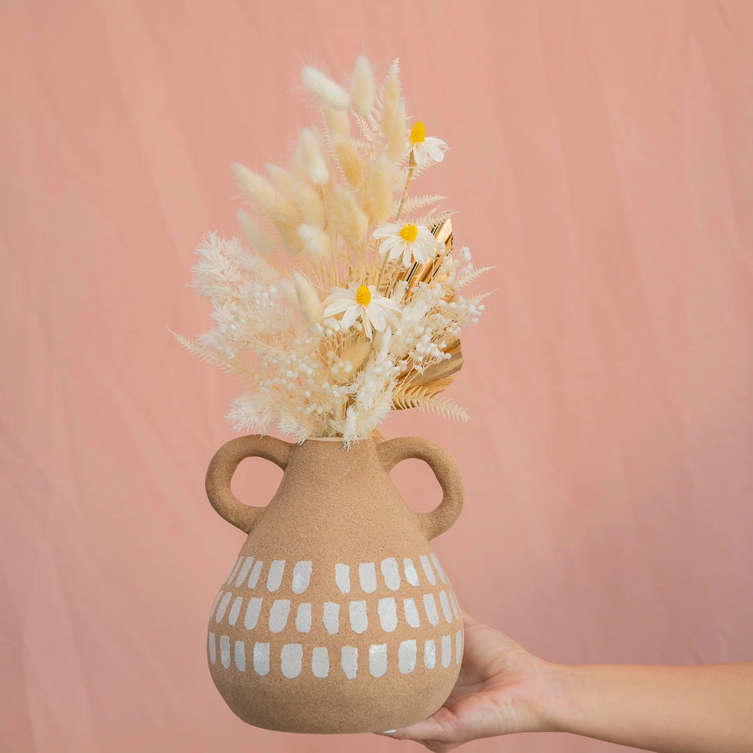 Handmade Ceramic Vase Included (16.5cml x 16cmw x 18cmh)Â featuring hand painted patterns in earthy tones, due to the nature of handmade items there may be slight variations in the size, surface texture, glaze consistency, colour or tone of the vase.
