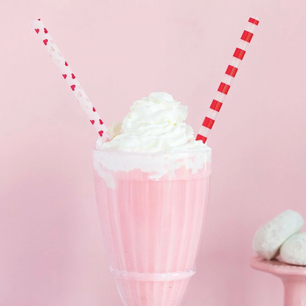 Sip Sip Hooray! Thick clear reusable straws with red hearts and red stripes. Perfect for Valentines Day, but also super cute for Christmas and any red themed birthday.