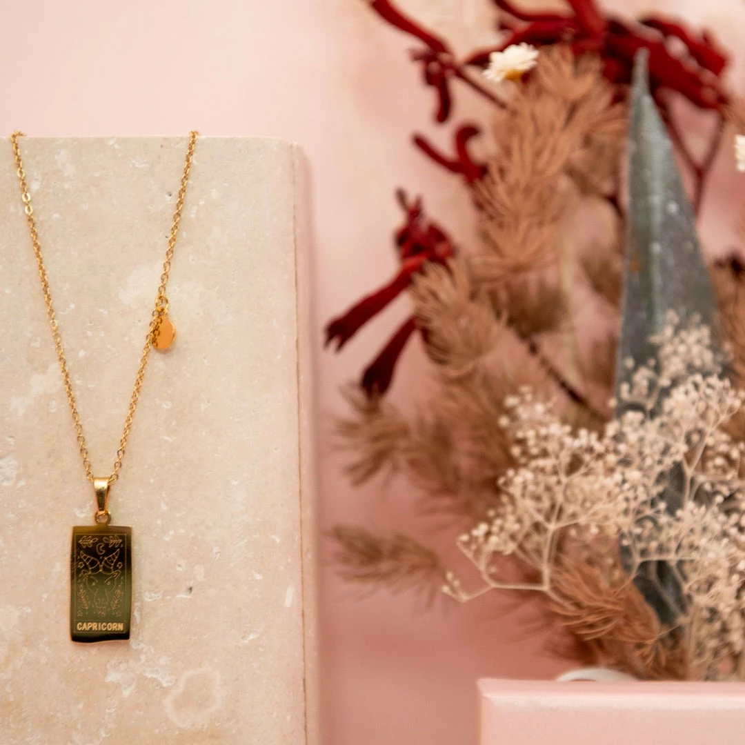 - Tarnish free 18K gold plated stainless steel pendant necklace, 19cm long chain, clasp closure, laser etched front and back